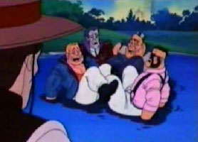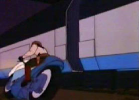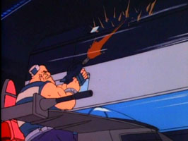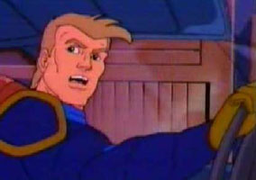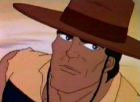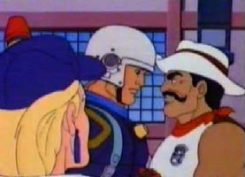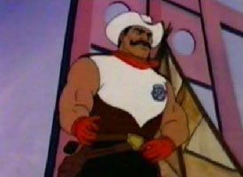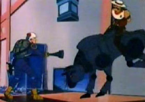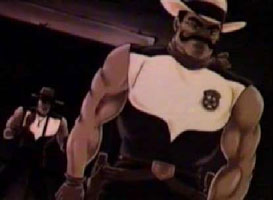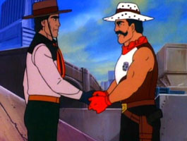Episode Name: The Case of the Pardner in Crime Episode Synopsis: We start the episode in the work area of a state penitentiary where Johnny Yuma and another criminal are working on some laundry...a large aircraft lands inside, dropping off more prisoners. As the aircraft takes off, Yuma ropes it with a clothesline and is yanked off to freedom! In an Empire City train station, a robot newspaper deliveryboy named "Frontpage" tries to sell a paper to the wrong guy, and Yuma tells him to deliver a message to Sundown of the COPS...they have some unfinished business. The robot gives the message to the COPS and Bullet-Proof relays the history between Sundown and Johnny Yuma: The two used to be fellow Texas Rangers who were the most feared tandom of Law Enforcement officers in the west...but Yuma got too greedy for his own good, and tried skimming some cash from their busts. Sundown caught him, but Yuma escaped and went on an unparalleled crime spree. Sundown caught up to him again, and this time Yuma ended up behind bars, something that Yuma never forgave Sundown for...and something perhaps Sundown never forgave himself for. Bullet-Proof finishes the story, and Mainframe wants to tell Sundown that Johnny's looking for him...however, Bullet-Proof thinks that's a bad idea, and wants to get more information before passing on the message, so Sundown doesn't rush into anything. They all agree to investigate further, unaware that Sundown is sleeping in the next room, and heard everything they had said. He knows this isn't just COPS business...this is personal. Johnny Yuma continues to hang around the train station, waiting for his message to be answered...and as he's leaving, Turbo Tu-Tone seems him and recognizes him, then gets orders from Big Boss to follow him wherever he goes. Yuma's first stop is a museum where he goes to the Outlaw Hall of Fame, and steals his lasso from one of the statue replicas. But, Sundown knew he'd be going after it, and he shows up at the museum, trying to talke Johnny out of his life of crime...Yuma's not listening, though, and snags Sundown in his lasso. Trapped on an out of control mechanical bull, Sundown activates his homing beacon, and Mainframe and Barricade are there to receive the signal. They charge into the museum as Sundown is launching around on the back of the crazed mechanical bull...Barricade tries to stop it with his mule, but it gets knocked out of his hand, and he gets cornered! It looks bad, until Mainframe yanks the Bull's power cord and stops it in its tracks. Barricade tries telling Sundown he's off the case...it's too personal. But Sundown lassos him and Mainframe and ties them up, then dashes off, swearing to stop Yuma before he commits another crime. The Crooks are meeting in Big Boss' high rise and Turbo reports in, revealing that Yuma is apparently planning on robbing the "Silver Bullet Express" train. Big Boss decides he wants Yuma to be a part of his gang, and he orders Berzerko to track him down and "recruit" him however he can. Berzerko, Buttons, and Rock Krusher head out to track down Yuma. The three Crooks (plus Turbo) find Yuma pretty quickly, but he's not interested in joining the gang, and he demonstrates this by lassoing all three of them and depositing them in a nearby pond. Berzerko and the crew are understandably annoyed at this, and swear to rob the Silver Bullet Express before Yuma gets to it. At the precinct, the COPS are trying to figure out what Yuma's plans might be, so Mainframe runs a check on his criminal profile, meanwhile Yuma himself is waiting for the train to pass through a long, dark tunnel. The train passes and Yuma rides his motorcycle up to it and leaps aboard the train, then separates the security car from the rest of the train with some fancy lasso work. He climbs up on top to prepare to rob it, when Sundown suddenly appears, saying he tracked him down "Texas style". Sundown tackles him, but before they can fight too long, the Crooks show up on Air Speeders, laying down the lead. The two former Texas Rangers are forced to take cover. The Crooks bust into the train and start loading up on loot, but Yuma and Sundown move in to stop them. With some fancy lasso work the two cowboys hijack some air speeders and bring down Berzerko and his thugs. Turbo tries to escape, but the COPS reinforcements arrive in the form of Mainframe, Bullet-Proof, and Barricade, and quickly bring him in. As the Crooks are being relayed into the paddy wagon, Sundown lets Yuma know that when he finishes his prison sentence, he still has his Ranger badge if he wants to join back up. Yuma is honored, and the two friends shake hands before parting ways. |