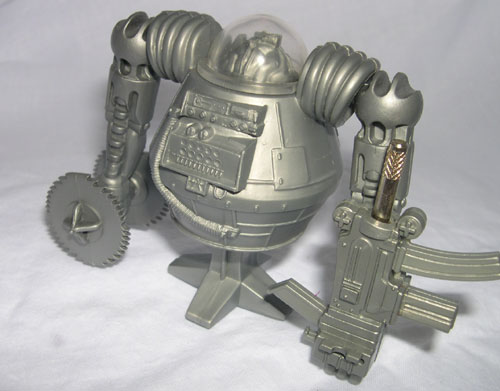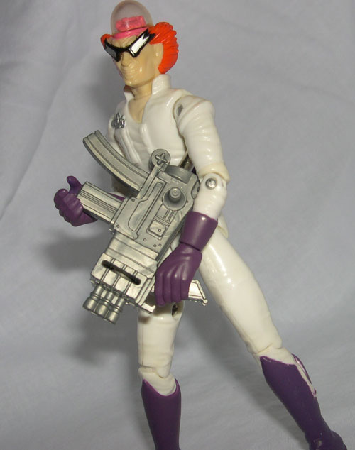 His accessories are also very interesting. He comes with his self-constructed robot named "Buzzbomb" who became a pretty central character in several forms throughout the comic and cartoon history, and he comes with a multi-barreled machine gun which he can hold, or give to his robot to use, which works even better. All in all, not a vast assortment of accessories, but the coolness makes up for it.