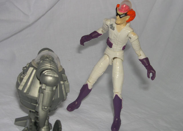 The toy however, has a much more super villain look to it, and a much more effective design. The overly thin, scrawny mold just makes him look wirey and devilish, and the wrinkles of his labsuit seem to wrap around his frame perfectly. His labcoat is a nice mixture of traditional appearence with science fiction villain undertones and the mixture works quite well together. Add in his angled, elbow length gloves and tall purple boots, and he seems like more than just an overly skinny science nerd...he actually seems like a threat.