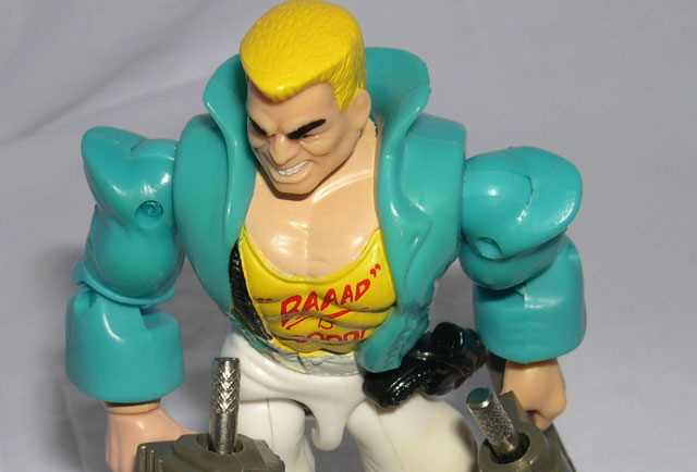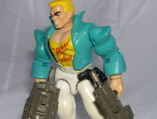The paint apps are a little hit or miss. His light blue jacket and white pants are classic 80's, but still look all right, even mixed with the yellow shirt underneath. The colors are garrish and bright, but it fits Berzerko's no-care personality and fits the character, even if they're somewhat hard on the eyes.