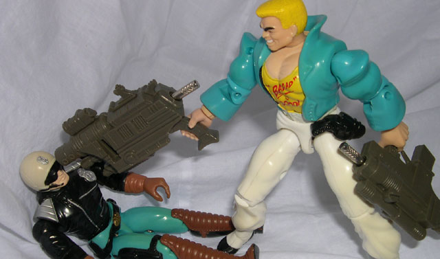 Berzerko was, believe it or not, the very first Crooks figure I bought to go along with the Bullet-Proof I bought for the C.O.P.S. side. I can't really say what drew me to him, whether it was his blatantly 80's style punk look (interesting considering this storyline is supposed to take place so far in the future), his crazed facial expression, or his twin hand cannons...whatever the reason, the figure appealed to me. Over the years, it has lost some appeal, mostly due to the moronic tendencies of the character in the comic and cartoon, but the figure still has some interesting redeeming qualities and isn't that bad, when it comes right down to it.
