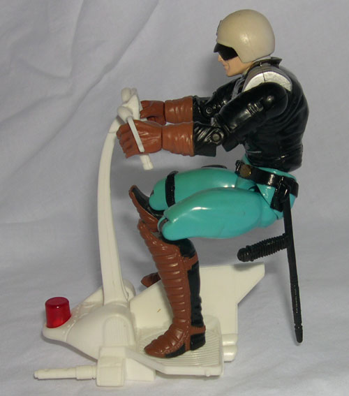 Like many of the other C.O.P.S. in the first series, this figure looks remarkably similar to the current day equivilent. Round, white helmet and goggles, typical black leather jacket, but here with some somewhat modern silver shoulder pads. His typical police blue pants are topped off by knee-high padded leather boots, which look fine...overall the figure is pretty skinny, but retains some bulk in the jacket area, and looks as you would expect a bike cop to look. The figure itself is pretty cool and has smooth moving articulation, which always helps.