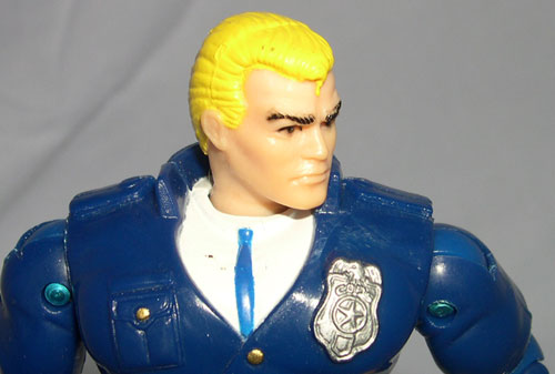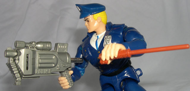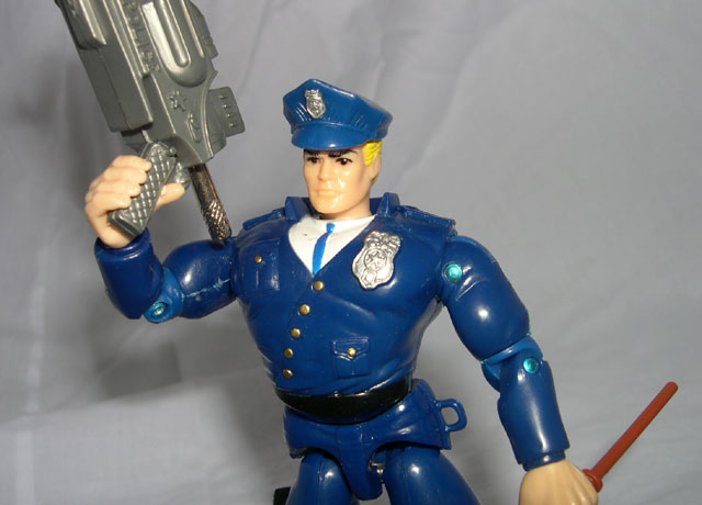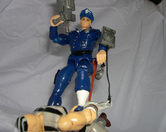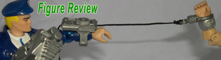 The paint apps are fine and "real world" although nothing outragerously special. The typical blue and white uniform looks fine and fits his mold...it's just not real exciting. His accessories are pretty cool and he has a number of them. His power-cuff is definitely his most classic weapon, attached to a string to snag Crooks on the run. The toy version was never quite as cool as it appeared in the cartoon or comic, but it's still somewhat neat. The police cap is cool and his nightstick works as well. His main machine gun leaves a little to be desired. The weapon itself looks pretty neat, but it's a little snubby and tough for him to hold realistically...I kind of wish he had come with a more "traditional" pistol like Highway, Bowser, or Heavyweight in the later runs.