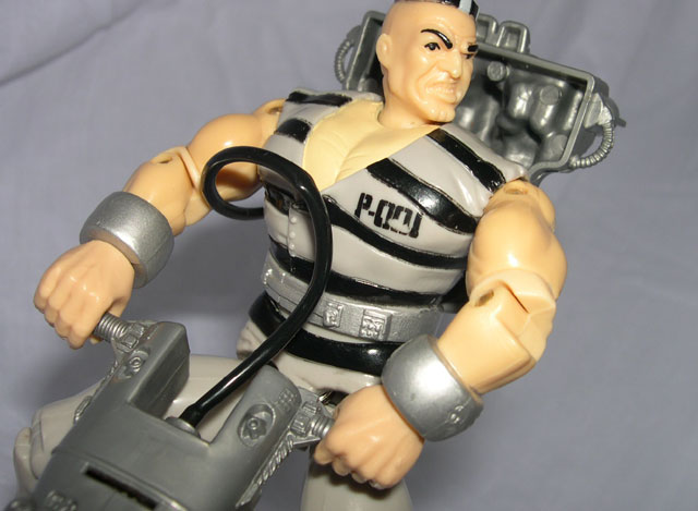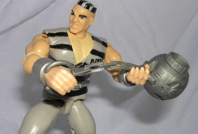 The colors here are just...bland. Plain grays are throughout with some black stripes and little silver bits thrown in...the figure just doesn't look all that exciting. The accessories don't help a whole lot either, coming merely with a backpack, jackhammer, and wrecking ball/ball and chain type of weapon, that doesn't leave Rock Krusher with much defense against firearm-wielding law officers, and doesn't make for a very exciting accessory compliment.