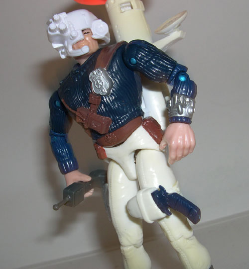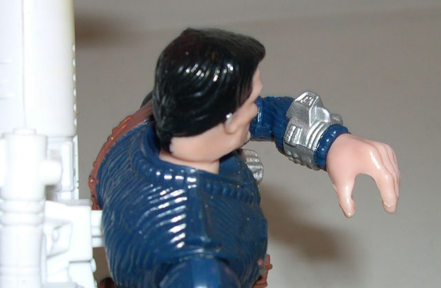 The colors are also pretty effective, with a dark, dark blue sweater, white pants and nice hints of silver for his tech gear. An aforementioned shoulder strap wraps up around the shoulder and goes across the chest and is a nice, realistic leather hue. All in all, the colors are bright, but realistic, and appealing.