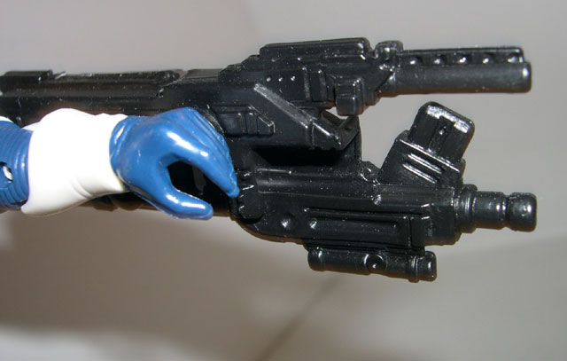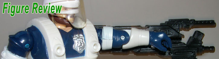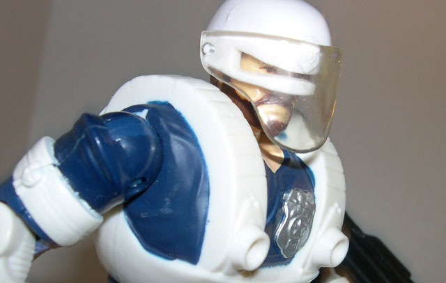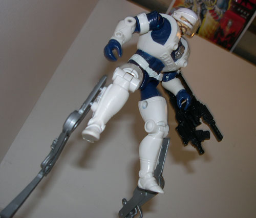 I find A.P.E.S.' colors to be remarkably similar to Airwave with dark blues and whites, and like Airwave it works pretty well here, too. Nothing elaborate or intricate, but it looks nice enough along with the silver badge and gear. Speaking of the gear, well... I'm really not too impressed with the focus of the figure here, which is the strange legs and arms that don't really seem to serve any purpose. However, I do really like the helmet and awesome clear facemask/visor that goes along with it...I also really dig the clip on heavy machine gun, too. Great format, very cool design scheme. The twin barrels look great and give him a machine gun and shotgun type of weapon all in one combined gun, and it looks very cool. So while I really do not like those funky legs, there are redeeming qualities to some of the accessories and are definitely cool.