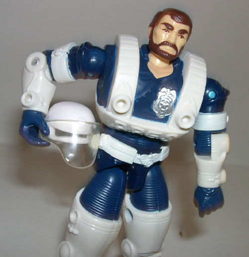 Robert Waldo, the man behind the A.P.E.S. is described as being a genius and inventor for the C.O.P.S. team, which is a nice hole that needed filling here, especially considering Mainframe was only a comic and cartoon character at this point and the team didn't really have a technology expert. I can see this guy filling that role, and even his facial sculpt gives him that typical look. The body style is huge and lumbering with an immensely broad chest (which might be exhaggerated by armor) and is in general an imposing figure. His uniform, underneath the trapping, looks like a padded, layered, protective costume which is nicely trimmed with the white tech-vest and tall boots. This vest, these boots, and the gauntlets have these interesting sockets to fit different gear, and gives him some expandability.