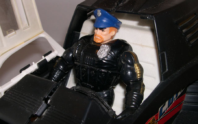His colors are also nicely different. He's got a serious black base uniform, but the gold strapping down his arms and on his holsters really brings a nice bright color to the figure and makes him stand out. Combine this with the rich, deep blue of his boots and police cap and the figure looks vibrant and interesting, in spite of being mostly black. His accesory compliment is small, with just a single pistol and cap, but he doesn't need much behind the wheel of the A.T.A.C.