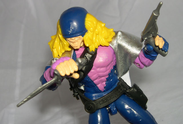 His accessories once again border on the bizarre...bizarre, but cool. Along with the attached cape, he has the aforementioned helmet/facemask with long blonde hair, a scary looking grin and purple helmet. This gives the character an almost entirely different appearence, and I dig it. He also has a very strange battering ram type of weapon that clips to his arm and pops out an almost spiked prong...it's strange, but potentially disturbing.