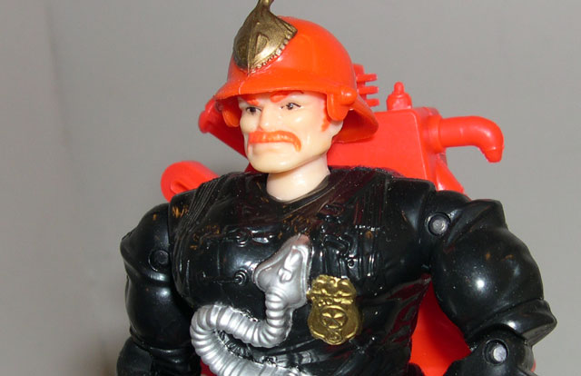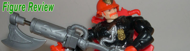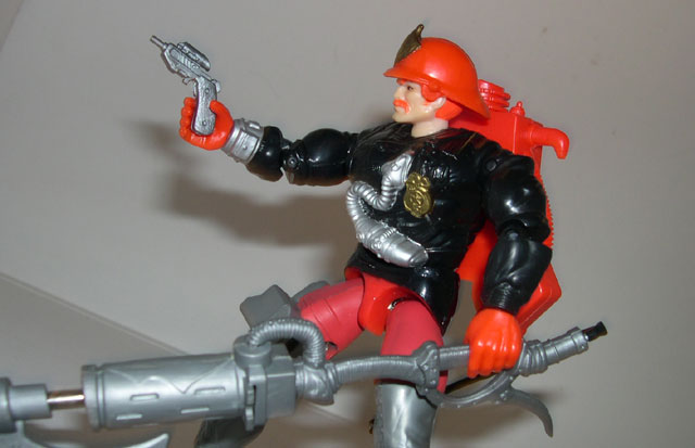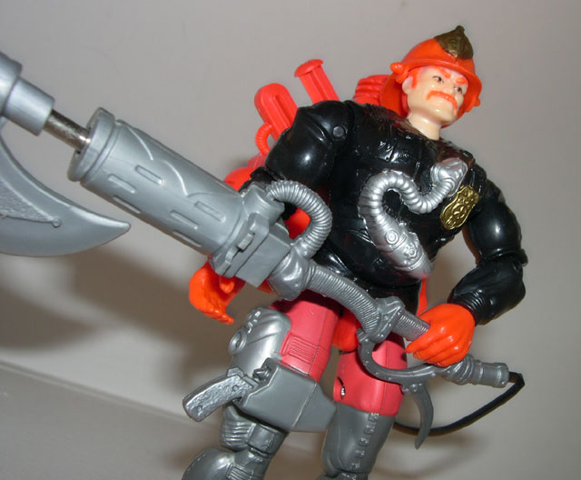 While the first series of the C.O.P.S. toyline featured mainly people of the law enforcement variety, in series two, they branched out a little bit. Guys like Checkpoint from the military, Powderkeg from the Bomb Squad, and here is Inferno, a member of the Fire Department. In fact, Inferno almost looks like a one-man Fire Department, with all of the huge equipment.