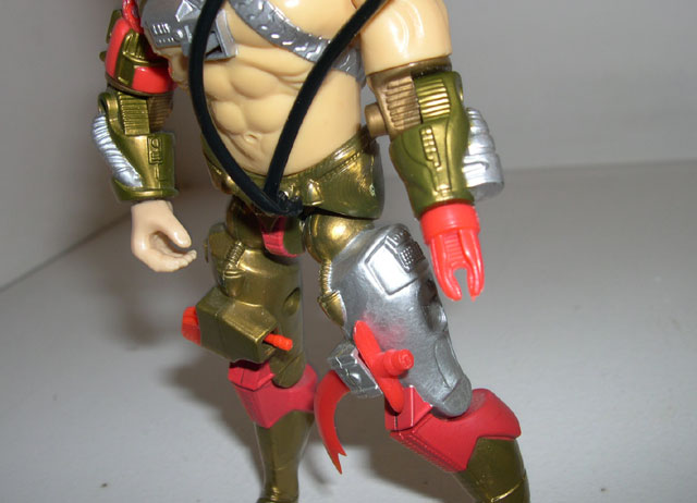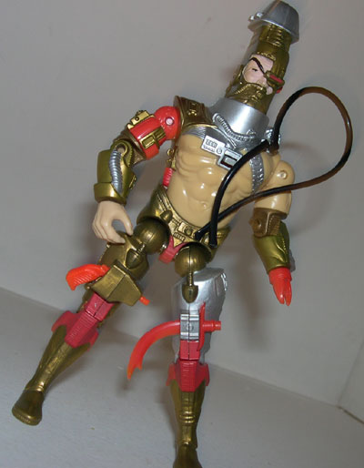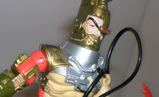 His torso, though, is probably the most interestingly designed, with a high collar metal chest plate that looks to have a shoulder-mounted laser weapon, and which actually holds the firing mechanism for the caps, which are set off by his head, which incidently fires completely off of his body. Kind of an odd feature, especially considering there are some human characteristics on his head.