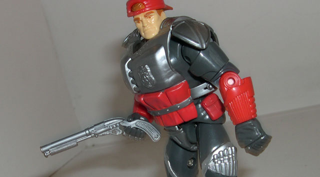 Now Powderkeg also comes with a terrific, elaborate helmet, that has several layers of protection with a flip down double-visor and several different looks each with its own level of coolness. He also comes with a very neat, simple baseball cap for those times when he doesn't need to defuse a bomb. There is also a large, clear, "cap-firing" bomb disposal unit, designed to contain the bomb that he finds and set it off without harming anyone. This is one of the more ingenius methods of integrating a cap-firing mechanism, and works very nicely. Powderkeg also comes with said "bomb" in the form of a briefcase, which, when shut, actually can function just as a briefcase, and add another, more normal, accessory to the mix. A grenade is also thrown in there, and as if that all wasn't enough, Powderkeg also gets a very, very cool western-style pump-action shotgun. I mean really...come on. Is there anything this guy DOESN'T come with? It's very cool to see him loaded up with all of his gear, yet if you want a more simple look, dropping the armor and sticking with a baseball hat and shotgun gives him a great look, too. This figure is very versatile.