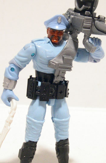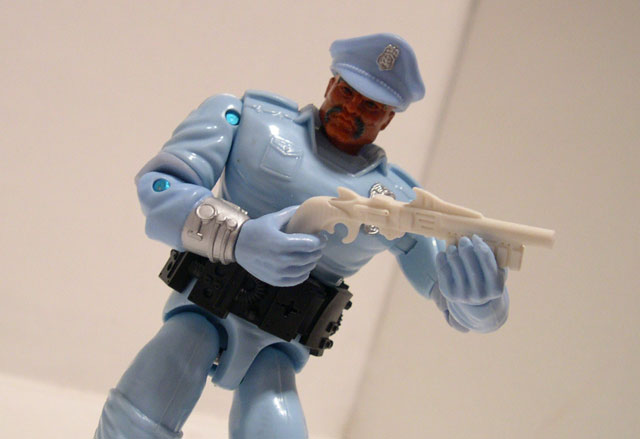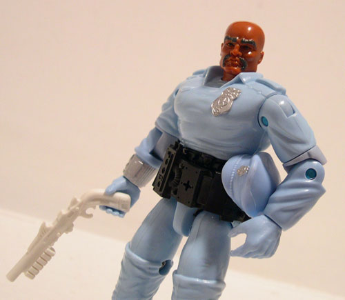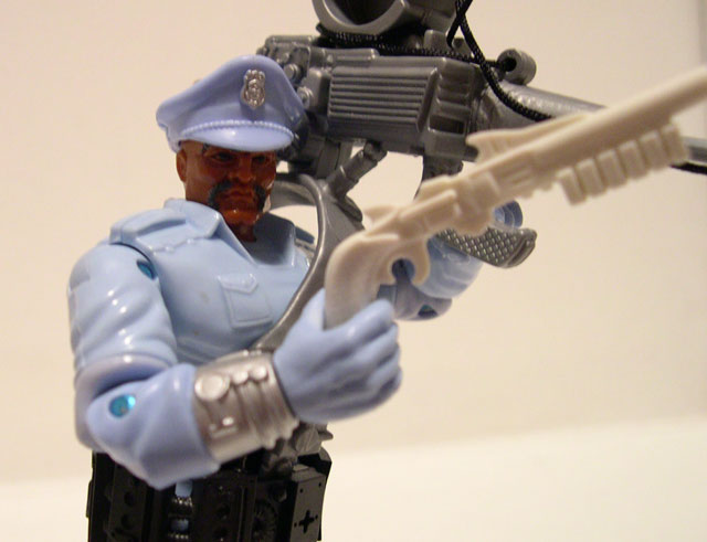 And his accessories don't help much either. He has your typical removable police hat, which is always appreciated, and also comes with a pretty neat white shotgun (is that non-lethal??). He has a wide strap of pouches or batteries possibly that wind around his waist and look all right. But the "thug-zapper" just seems like an inordinately clumsy device that just isn't cool enough to make up for the hassle of getting it setup just right. Sometimes a really cool weapon will still make you happy even if it's a pain in the butt. The zapper is just a pain in the butt with no real payoff.