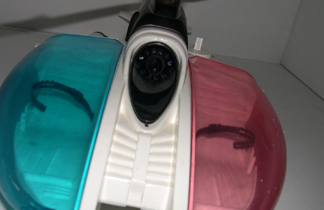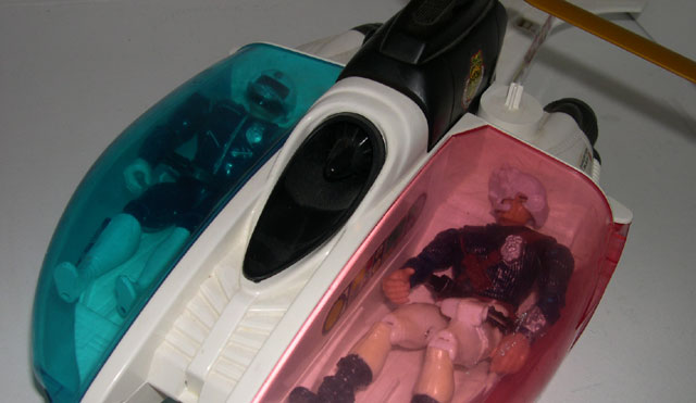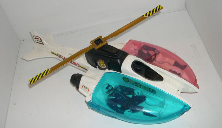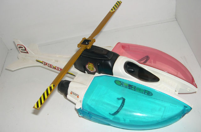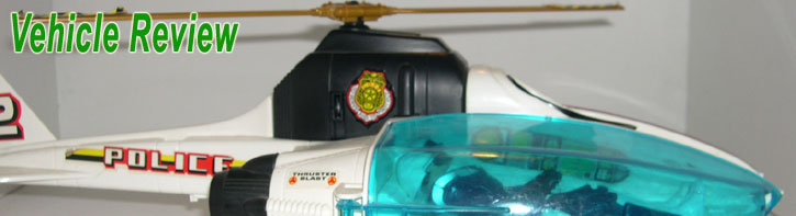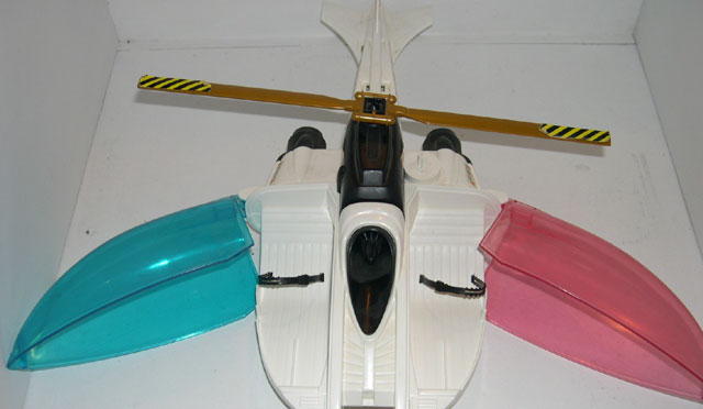 The shape of the front canopies is probably the most interesting part of it, with the two "bubble-like" cockpits in clear blue and red glass. I love this twin cockpit format, it really adds a neat distinctive look to the helicopter and gives it some "character". The weapons are all pretty effective, too, with a very nice chin machine gun, a wing/thruster mounted firing system (where the caps are fired) and even the small little siren underneath the rear tail all add a little something. All in all, it's a very neat aircraft, and one of the cooler of the vehicles for the toyline.
