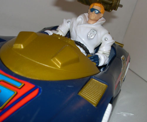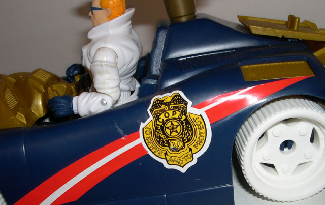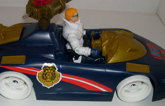 The colors are really pretty neat, too. C.O.P.S. has always been about some funky color schemes and out there designs, and they manage to marry funky colors with purpose perfectly. The Interceptor is a nice rich, dark purple car with bright white wheels and gold trim. Yet, as unusual as this color scheme sounds, it all works terrific and the car looks great, even in a somewhat strange pallet. Another strong selling point is Roadblock, the figure included with this fine vehicle. He has a terrifically simple, unique mold that is one of the unknown gems of the C.O.P.S. line. This combined with the beautiful style of the Highway Interceptor makes it one of the more desirable vehicles in the line.