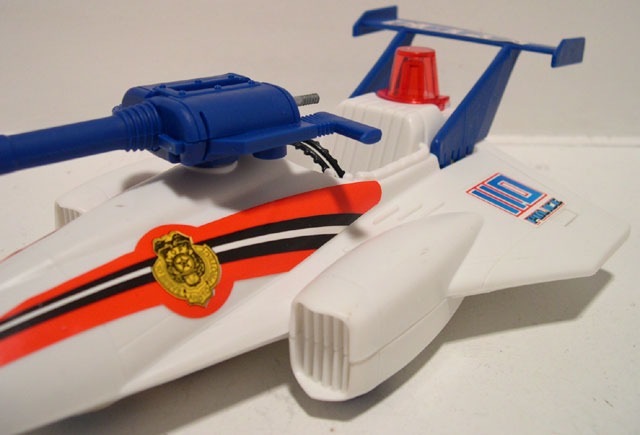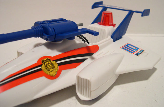 There are some engine compartments on each wing and the ubiquitous spoiler on the back for wind deflection as you fly through the air. The cockpit is open, perched just behind an oversized cannon which also looks like it doubles as controls for the plane itself. While there probably wasn't a whole lot of "real world" thought put into this mini-jet, it still has some fun design and play features, even if it is wholly unrealistic. And of course, you have the siren on the back of the plane, and I always love that.