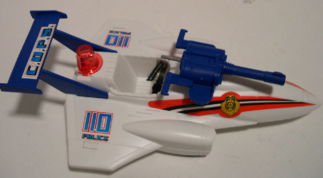As I've mentioned throughout the reviews, for the most part, the larger vehicles are more successful, although some of the small ones have their own appeal as well. The Pursuit Jet is just so silly that it's almost neat. It's a small mini-jet type vehicle, and seems to be the C.O.P.S. answer to the Jailbird Airspeeder, but it's much more plane-formatted. It's a pretty small vehicle, kind of a kayak with wings, and pretty small wings at that. Still, the wings have a neat angular shape, and the front of the plane is nicely sloped into a rounded point. In general, it kind of has a fighter jet shape, but in a much smaller size.