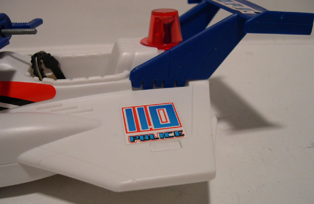The colors are also pretty straight forward...it's got a generic white body and wings, with a nice dark blue front-mounted machine gun and blue spoiler. Blue and white are pretty universal police-themed colors, so they work here, and still manage to keep the pursuit jet looking nicely different compared to others that the C.O.P.S. pilot around. However, it does bear a passing resemblance, color-wise, to the Air Raid helicopter, which is neat to kind of draw them both into the same air group. The stickers help bring some life into the small, substance-less mini-jet adding some cool racing stripes and logos aplenty.